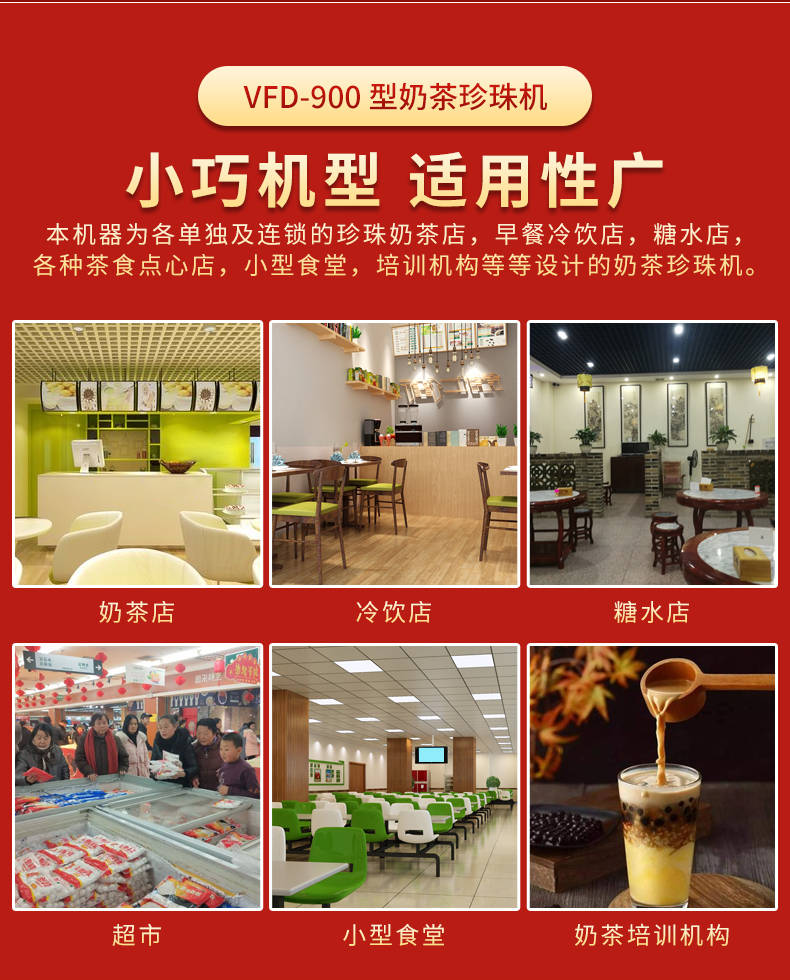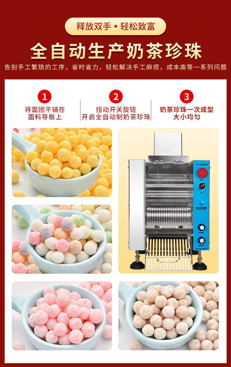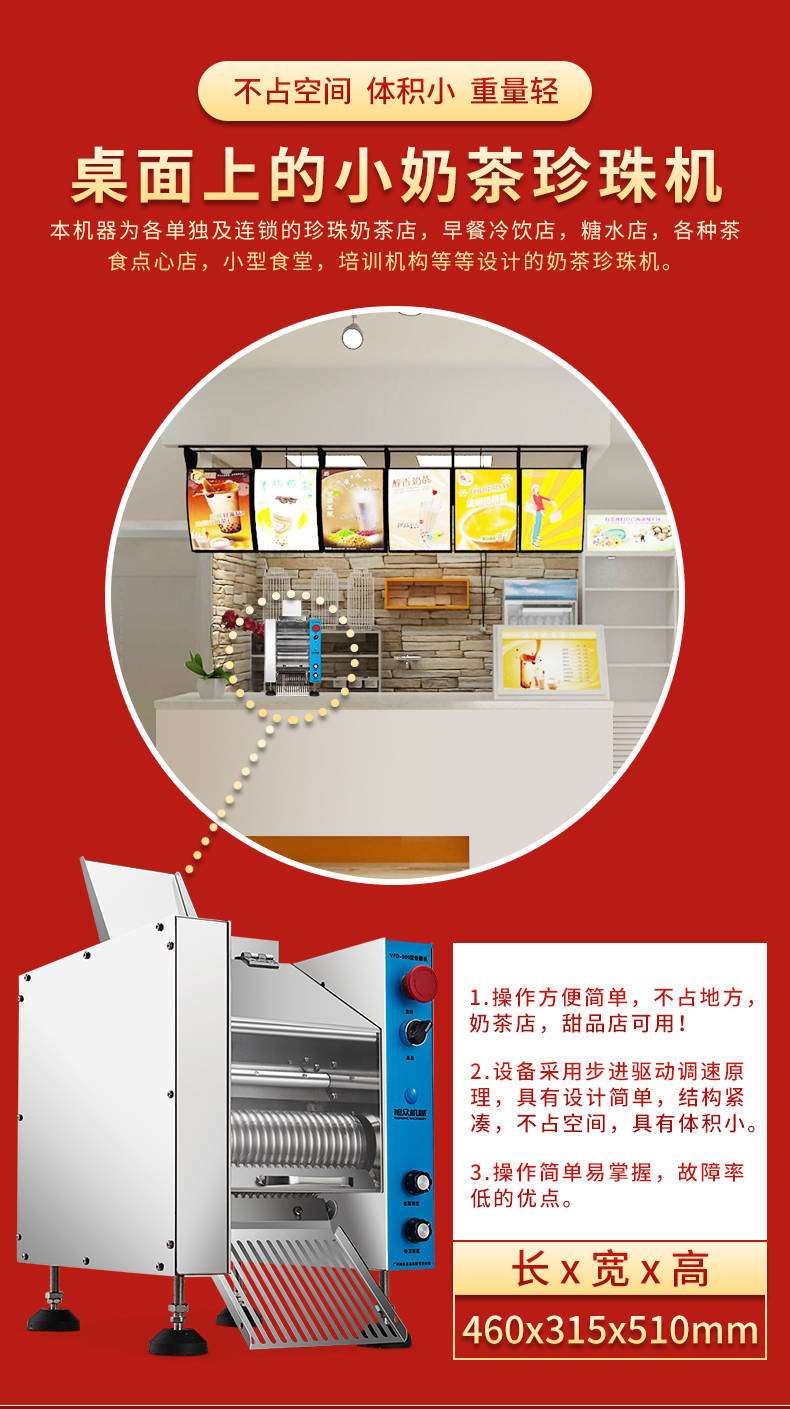VFD-900珍珠奶茶機(jī),奶茶店、甜品店可用。可生產(chǎn)奶茶珍珠,果蔬圓子,無(wú)餡湯圓,水晶湯圓,各種芋圓。不占空間、體積小、重量輕,桌面上的小奶茶珍珠機(jī)。告別手工繁瑣的工序,省時(shí)省力,輕松解決手工麻煩,成本高等一系列問(wèn)題
