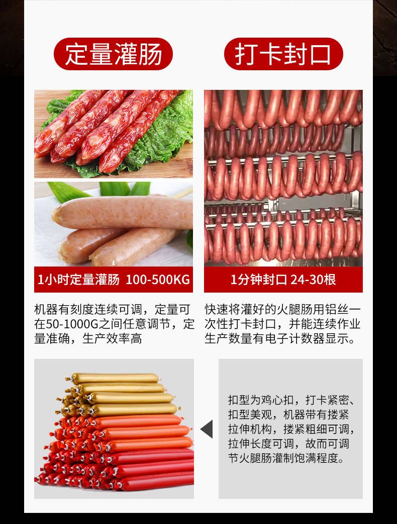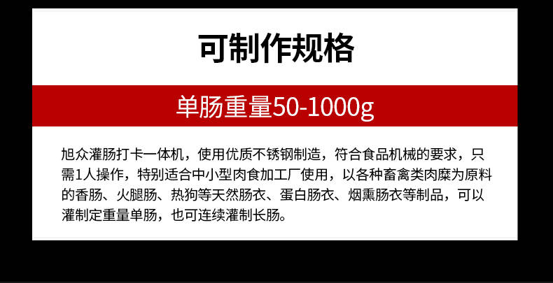 XZ-I型自動定量灌腸機(jī),使用優(yōu)質(zhì)不銹鋼制造,符合食品機(jī)械的要求,只需1人操作,特別適合中小型肉食加工廠使用,以各種畜禽類肉糜為原料的香腸、火腿腸、熱狗等天然腸衣、蛋白腸衣、煙熏腸衣等制品,可以灌制定重量單腸,也可連續(xù)灌制長腸。