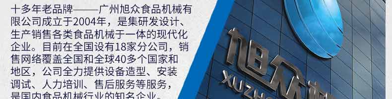 廣州旭眾食品機(jī)械有限公司是一家集科研開發(fā),生產(chǎn)設(shè)計,營銷服務(wù)為一體的現(xiàn)代化生產(chǎn)企業(yè)?,F(xiàn)代化生產(chǎn)車間,精湛制造技術(shù),所產(chǎn)機(jī)械歷經(jīng)市場重重考驗(yàn),不斷贏得海內(nèi)外客戶的贊譽(yù)。