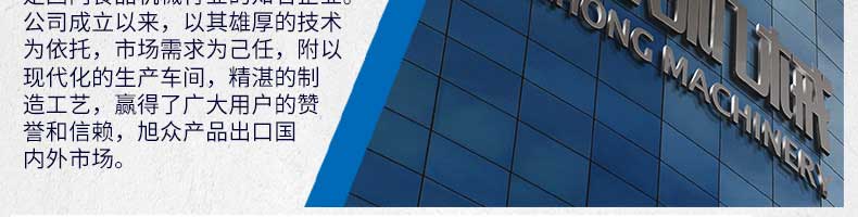 廣州旭眾食品機(jī)械有限公司是一家集科研開發(fā),生產(chǎn)設(shè)計(jì),營(yíng)銷服務(wù)為一體的現(xiàn)代化生產(chǎn)企業(yè)?,F(xiàn)代化生產(chǎn)車間,精湛制造技術(shù),所產(chǎn)機(jī)械歷經(jīng)市場(chǎng)重重考驗(yàn),不斷贏得海內(nèi)外客戶的贊譽(yù)。
