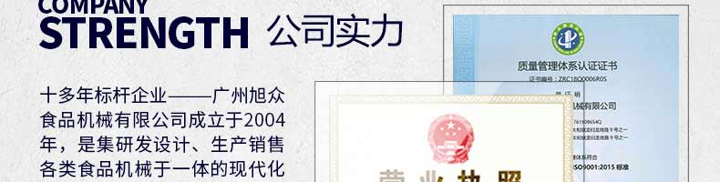 廣州旭眾食品機械有限公司是一家集科研開發(fā),生產(chǎn)設(shè)計,營銷服務(wù)為一體的現(xiàn)代化生產(chǎn)企業(yè)?,F(xiàn)代化生產(chǎn)車間,精湛制造技術(shù),所產(chǎn)機械歷經(jīng)市場重重考驗,不斷贏得海內(nèi)外客戶的贊譽。