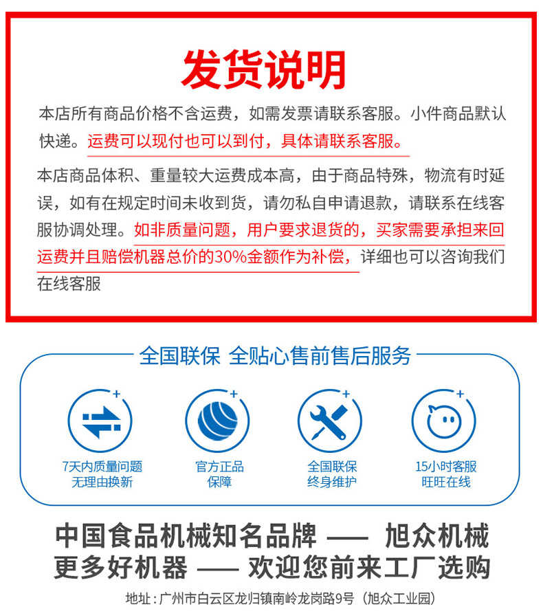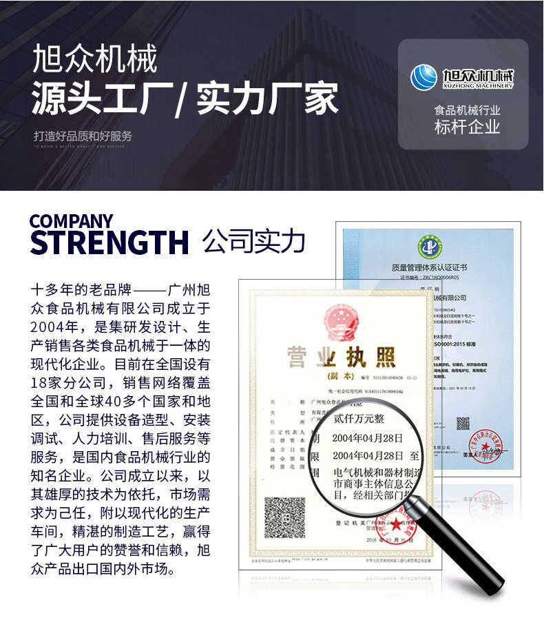 廣州旭眾食品機(jī)械有限公司是一家集科研開(kāi)發(fā),生產(chǎn)設(shè)計(jì),營(yíng)銷服務(wù)為一體的現(xiàn)代化生產(chǎn)企業(yè)?,F(xiàn)代化生產(chǎn)車間,精湛制造技術(shù),所產(chǎn)機(jī)械歷經(jīng)市場(chǎng)重重考驗(yàn),不斷贏得海內(nèi)外客戶的贊譽(yù)。
