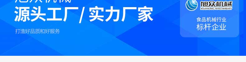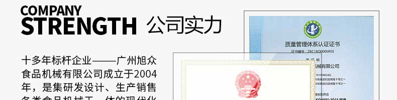 廣州旭眾食品機(jī)械有限公司是一家集科研開發(fā),生產(chǎn)設(shè)計(jì),營銷服務(wù)為一體的現(xiàn)代化生產(chǎn)企業(yè)?,F(xiàn)代化生產(chǎn)車間,精湛制造技術(shù),所產(chǎn)機(jī)械歷經(jīng)市場重重考驗(yàn),不斷贏得海內(nèi)外客戶的贊譽(yù)。