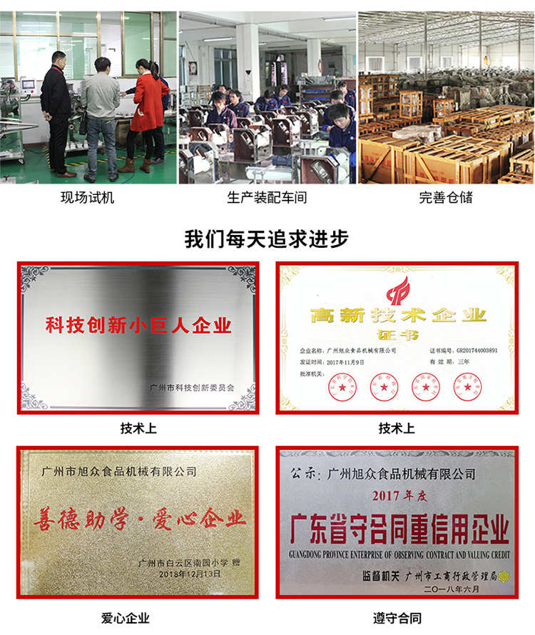 廣州旭眾食品機(jī)械有限公司是一家集科研開發(fā),生產(chǎn)設(shè)計(jì),營銷服務(wù)為一體的現(xiàn)代化生產(chǎn)企業(yè)?,F(xiàn)代化生產(chǎn)車間,精湛制造技術(shù),所產(chǎn)機(jī)械歷經(jīng)市場重重考驗(yàn),不斷贏得海內(nèi)外客戶的贊譽(yù)。