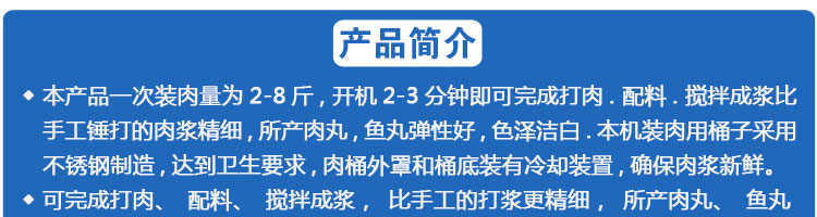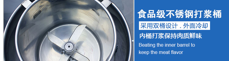 SZ-22型肉丸打漿機(jī),本機(jī)裝肉用桶子采用不銹鋼制造,達(dá)到衛(wèi)生要求,肉桶外罩和桶底裝有冷卻裝置,確保肉漿新鮮。比手工的打漿更精細(xì),所產(chǎn)肉丸、魚丸彈性好,色澤潔白。
