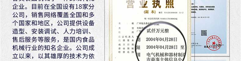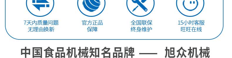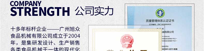 廣州旭眾食品機械有限公司是一家集科研開發(fā),生產設計,營銷服務為一體的現(xiàn)代化生產企業(yè)?,F(xiàn)代化生產車間,精湛制造技術,所產機械歷經市場重重考驗,不斷贏得海內外客戶的贊譽。