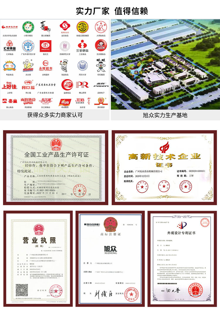 廣州旭眾食品機械有限公司是一家集科研開發(fā),生產(chǎn)設(shè)計,營銷服務(wù)為一體的現(xiàn)代化生產(chǎn)企業(yè)?,F(xiàn)代化生產(chǎn)車間,精湛制造技術(shù),所產(chǎn)機械歷經(jīng)市場重重考驗,不斷贏得海內(nèi)外客戶的贊譽。