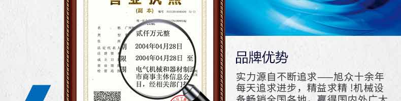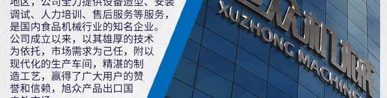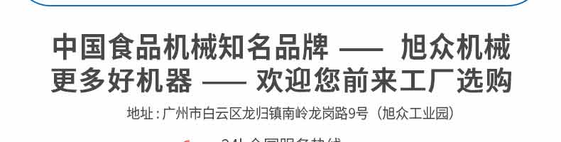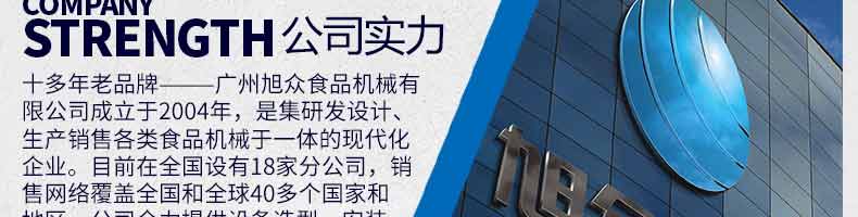 廣州旭眾食品機械有限公司是一家集科研開發(fā),生產設計,營銷服務為一體的現(xiàn)代化生產企業(yè)?,F(xiàn)代化生產車間,精湛制造技術,所產機械歷經(jīng)市場重重考驗,不斷贏得海內外客戶的贊譽。