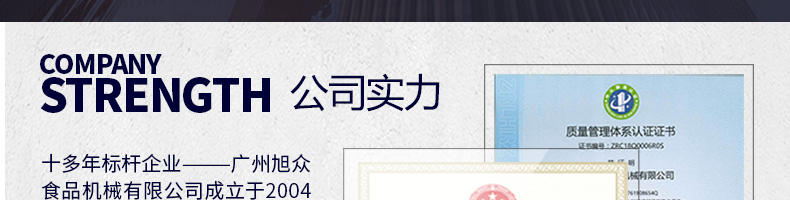 廣州旭眾食品機械有限公司是一家集科研開發(fā),生產(chǎn)設計,營銷服務為一體的現(xiàn)代化生產(chǎn)企業(yè)?,F(xiàn)代化生產(chǎn)車間,精湛制造技術,所產(chǎn)機械歷經(jīng)市場重重考驗,不斷贏得海內(nèi)外客戶的贊譽。