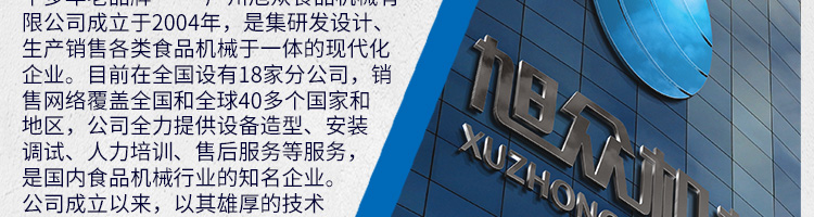 廣州旭眾食品機械有限公司是一家集科研開發(fā),生產(chǎn)設計,營銷服務為一體的現(xiàn)代化生產(chǎn)企業(yè)?,F(xiàn)代化生產(chǎn)車間,精湛制造技術,所產(chǎn)機械歷經(jīng)市場重重考驗,不斷贏得海內外客戶的贊譽。